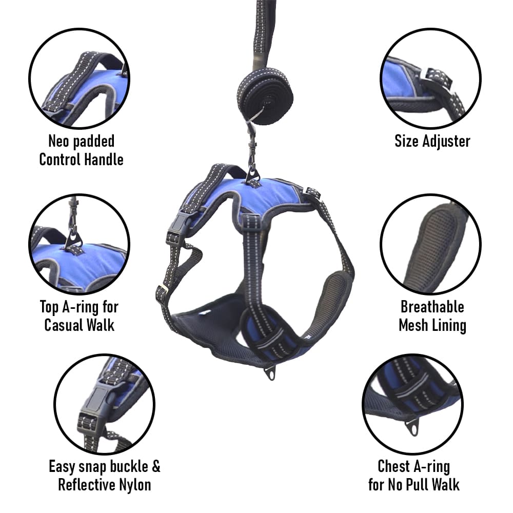 𝗙𝗨𝗟𝗟𝗬 𝗔𝗗𝗝𝗨𝗦𝗧𝗔𝗕𝗟𝗘 𝗗𝗢𝗚 𝗛𝗔𝗥𝗡𝗘𝗦𝗦 – Designed for the perfect fit, this harness features 4 adjustable straps around your dog’s body. With 2 neck straps and 2 chest straps, you can easily customize the fit while allowing room for growth. No more worries about slipping out or choking.
