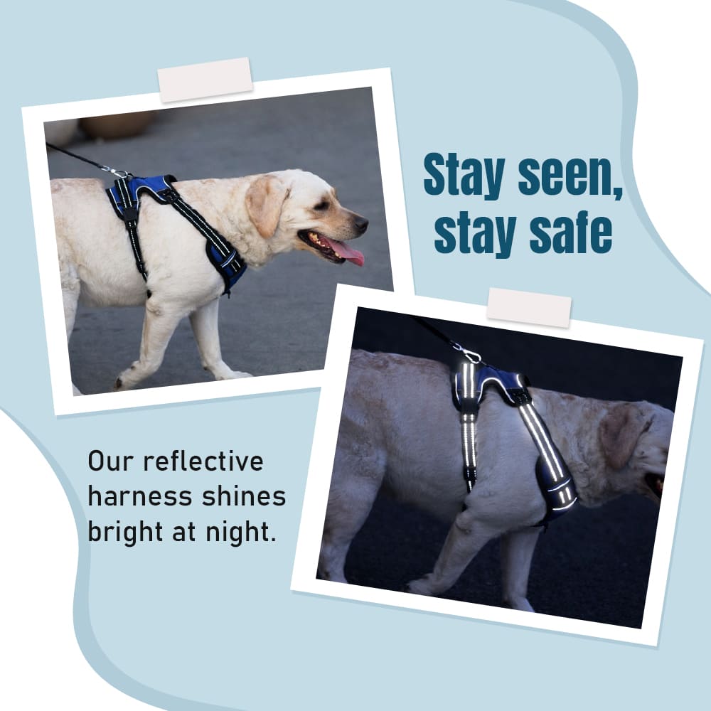 𝗘𝗡𝗛𝗔𝗡𝗖𝗘𝗗 𝗦𝗔𝗙𝗘𝗧𝗬 𝗙𝗢𝗥 𝗡𝗜𝗚𝗛𝗧 𝗪𝗔𝗟𝗞𝗦 – The Doggo Bite vest harness is equipped with super-bright 3M reflective strips for maximum visibility, helping keep your dog safe during both day and night walks. The wide reflective stitching adds an extra layer of safety during evening strolls.
