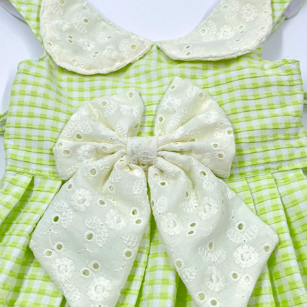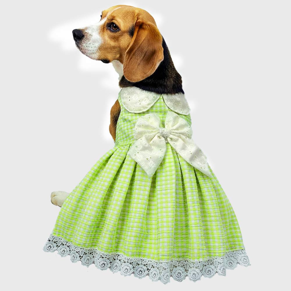 Meet Mint Lily bow dress, the sweetest gingham dress for pups who love comfort with style! This breathable mint-green dress features a soft gingham pattern, eyelet lace collar, dreamy oversized bow, and delicate lace trim for that picture-perfect finish. Designed to keep your pup comfy during walks, playdates, birthdays, and every adorable moment in between.