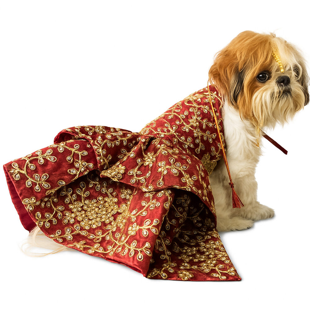 The embroidered Dog Lehenga Choli is a stunning piece of designer attire that is perfect for your furry companion. Made with premium designer fabric and featuring intricate details, this dog lehenga choli is sure to make your pet stand out at any festive or wedding celebration.