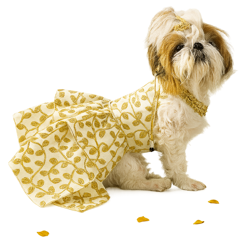 A designer lehenga choli for special occasions, this beautiful lehenga is designed for doggies! Suitable for all breeds, it has cotton lining inside suitable for pets, it has embroidery and work on it which gives it a luxurious look and feel. It also has a string for top and Velcro on waist which makes it adjustable according to your pets size. Crafted with care and attention to detail, this dog lehenga choli offers the perfect combination of style and comfort. The premium fabric and cotton lining ensure that your pet stays comfortable and at ease while wearing this outfit. Whether it’s a wedding, festival, or any special event, your pet will feel like a star in this designer ensemble.