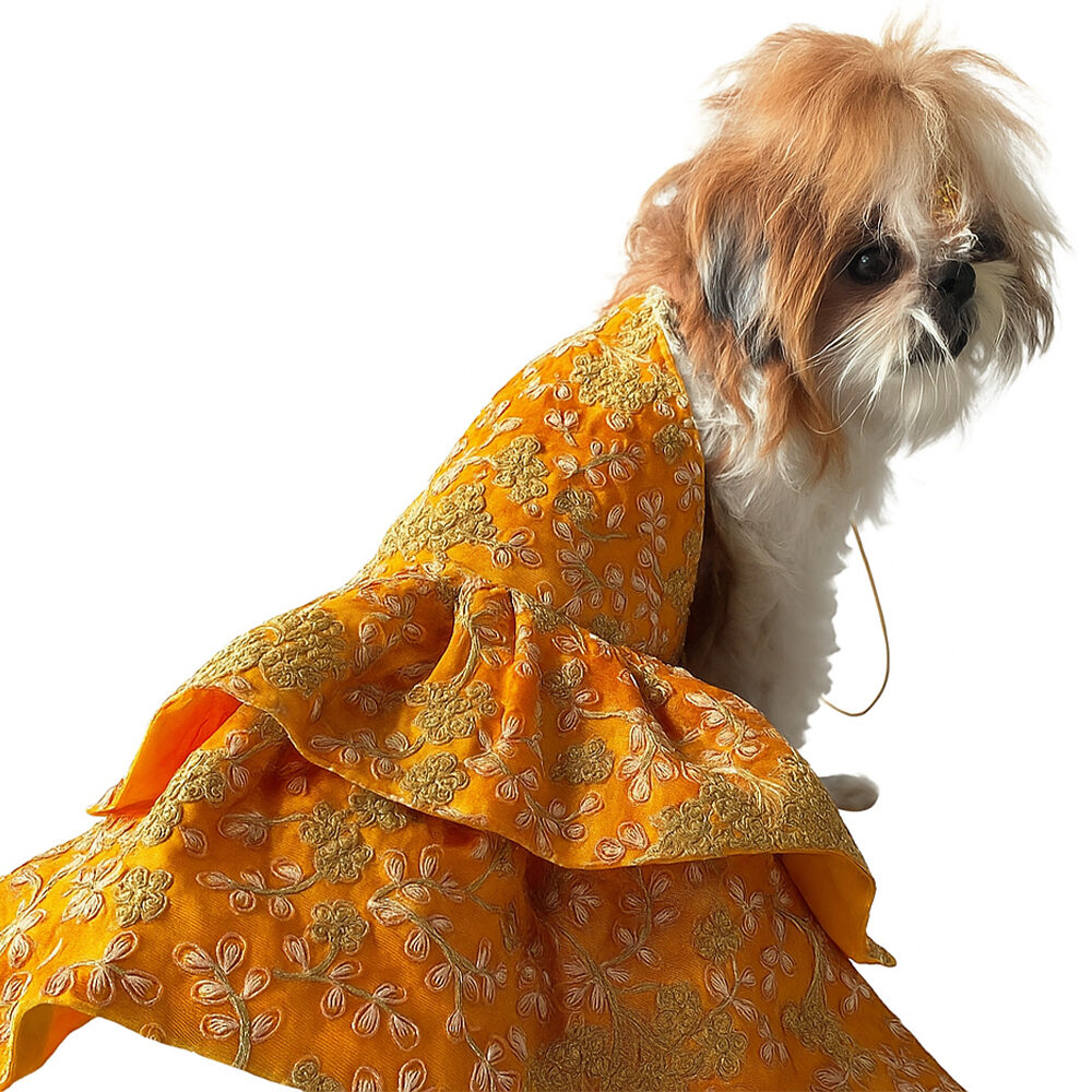 The embroidered Dog Lehenga Choli is a stunning piece of designer attire that is perfect for your furry companion. Made with premium designer fabric and featuring intricate details, this dog lehenga choli is sure to make your pet stand out at any festive or wedding celebration.